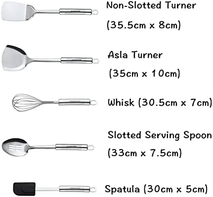 ✔Whisk (30.5cm x 7cm) ✔Spatula (30cm x 5cm) ✔Spaghetti Server (35cm x 8cm) ✔Asla Turner (35.5cm x 8cm) ✔Non-Slotted Turner (35cm x 10cm) ✔Slotted Turner (35.5cm x 8cm) ✔Skimmer (35cm x 11.7cm) ✔Slotted Serving Spoon (33cm x 7.5cm) ✔Basting Spoon (33cm x 7.5cm) ✔Ladle (34cm x 9.5cm) ✔Tongs (30cm x 3.5cm) ✔A Gift Box